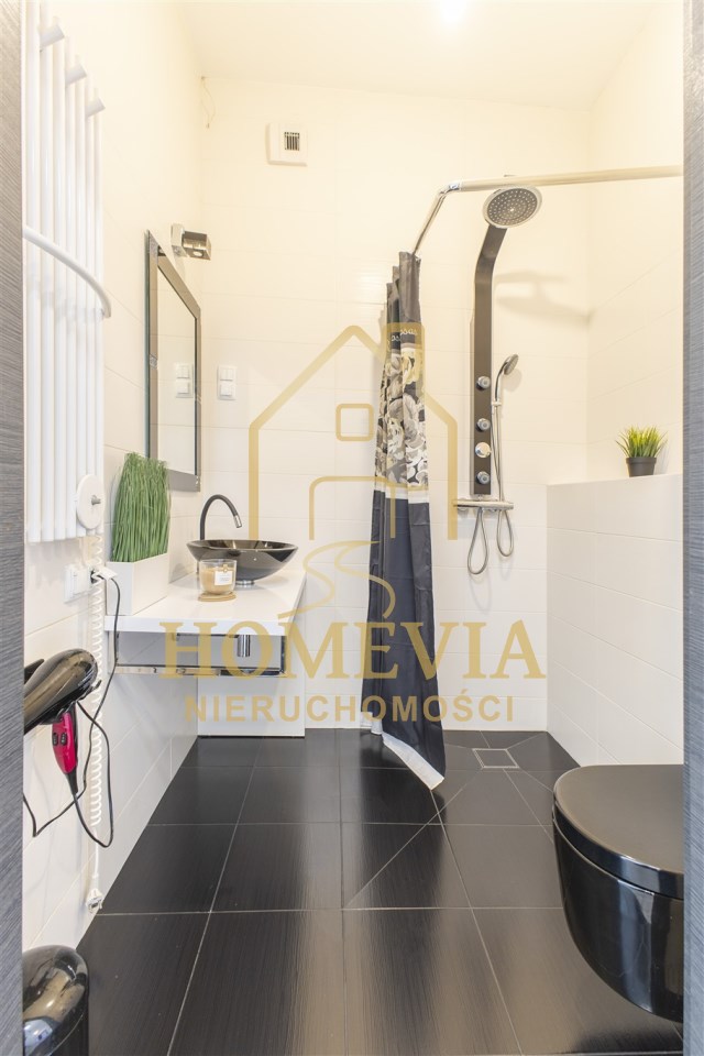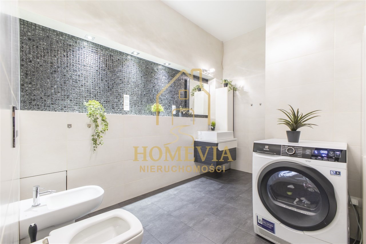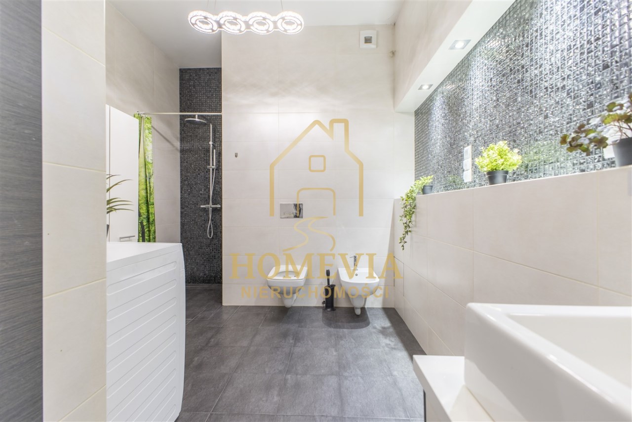 • łazienka z WC- eleganckie, przestronne pomieszczenie wyposażone w prysznic, WC, bidet, umywalkę, lustro z oświetleniem.