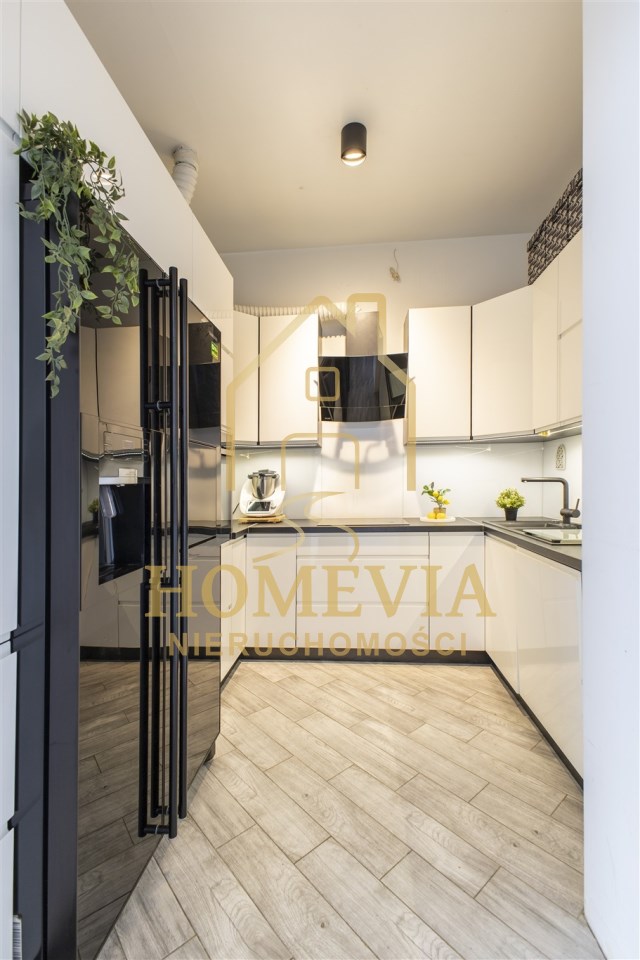 • kuchnia- z zabudową kuchenną wykonywaną na wymiar w pełni wyposażona w zmywarkę, płytę elektryczna, okap kuchenny, piekarnik oraz lodówkę.