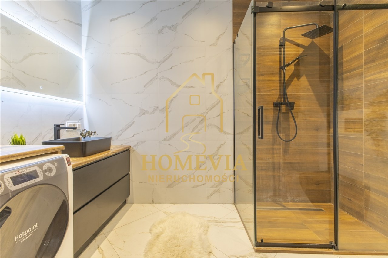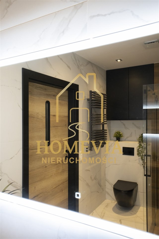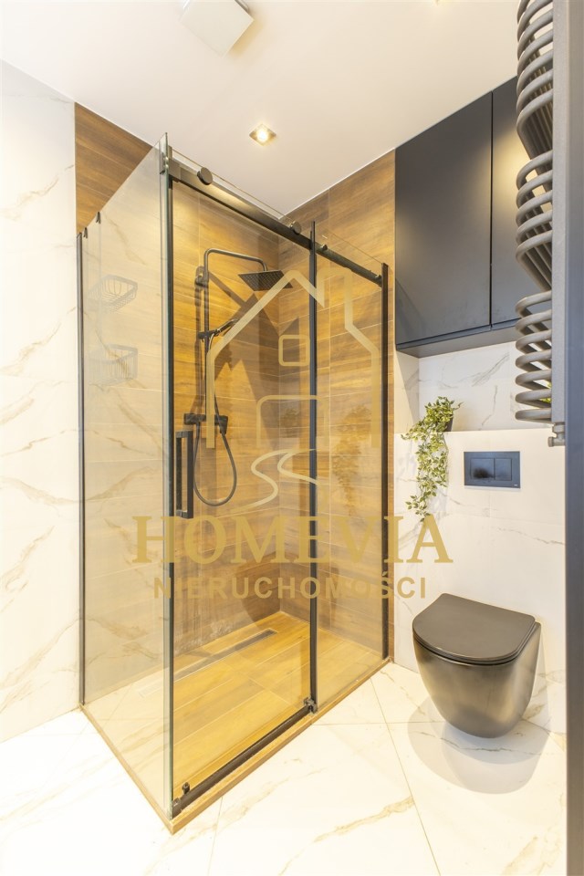 * Łazienka: Kompleksowe wykończenie pomieszczenia w stylu nowoczesnym przy użyciu płytek gresowych "marmur" oraz "drewno" w lini prysznicowej. Prysznic szklany, niskoprogowy z odpływem liniowym o wymiarach 120x90 umożliwia komfortowe użytkowanie. Meble wykonane kompleksowo i spójnie z całym mieszkaniem przez stolarza w kolorze drewna i czerni. Lustro LED, pralka serii Hotpoint Ariston. Armatura łazienkowa oraz dodatki wykończone w czarnym macie.