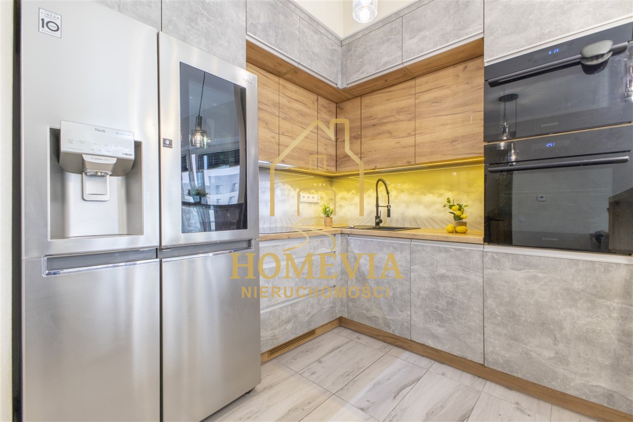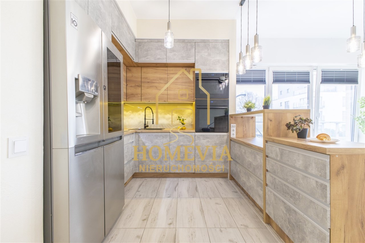 * Kuchnia: Aneks połączony i otwarty na salon, meble kaskadowe, w całości wykonane pod wymiar z dodatkowym oświetleniem LED. Ściany pozostawione poza zabudową wykończone w cemencie magnesowym. Pełne wyposażanie AGD wyższej klasy - komplet piekarnik + mikro. firmy Samsung, płyta indukcyjna + okap oraz zmywarka Bosch, lodówka 2-drzwiowa LG typ. InstaView.